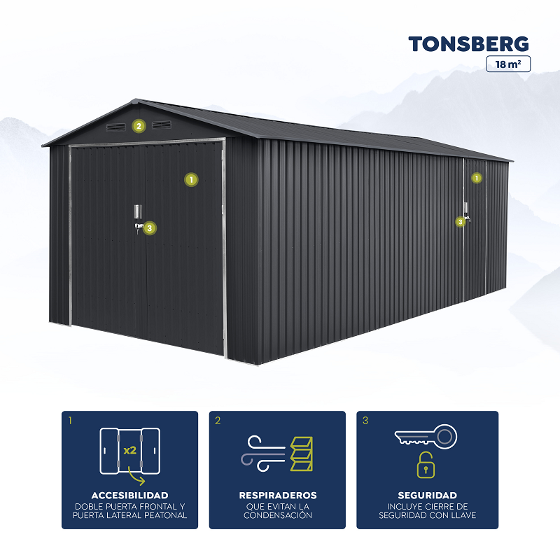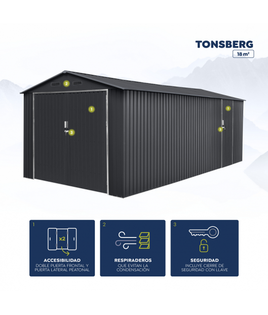 Apsaugokite savo automobilį, motociklą ar net valtį nuo netinkamų oro sąlygų. Metalinis garažas „Tonsberg“ yra su plačiomis, atveriamomis durimis, todėl lengvai įvarysite transporto priemonę į vidų. Dėl papildomo patogumo, garažo šone yra durys išėjimui ar įėjimui. Yra vandens latakai.