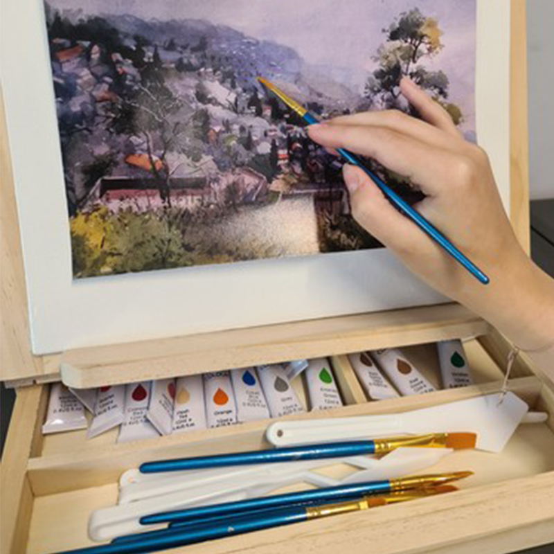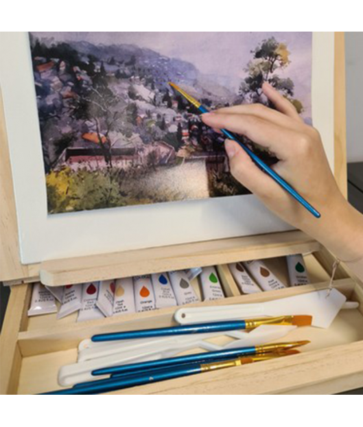 Piešimo komplektas yra puikus įrankis pradėti meno nuotykius dabar! Praktiško lagamino dėka visą komplektą nesunkiai išsinešite su savimi į lauką ar pas draugus. Rinkinį sudaro įvairių spalvų akvareliniai dažai, teptukai, paletė, mentelės, piešimo sąsiuvinis, kempinėlės ir net trys drobės.